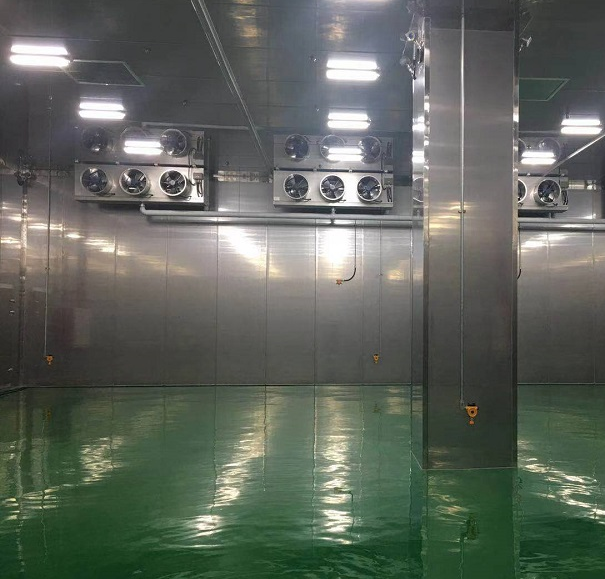 3、冷庫安裝室外制冷機組品牌:采用美國艾默生谷輪壓縮機、2號和4號冷藏庫配備兩臺制冷機組、其余每間冷庫配備一套機組、機組冷凝方式采用風冷、機組形式采用單機風冷箱式,末端采用特殊定制蒸發器不帶電機,寬片距防止結霜、當制冷設備把末端蒸發器盤管溫度降溫后,利用庫內新風系統的風量把蒸發器盤管的冷量帶出,從而達到冷庫降溫的目的,當溫度達到停機溫度時新風機組關閉,達到開機溫度時新風機組啟動。